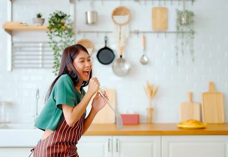 Je fais de la cuisine un moment heureux: je lance de la bonne musique, et hop, c’est parti ! En solo, en duo ou en famille, je chante en lavant, découpe en rythme, entame un pas de danse entre deux casseroles…
