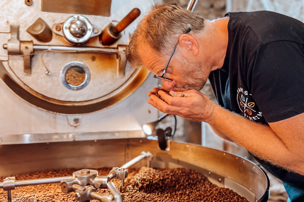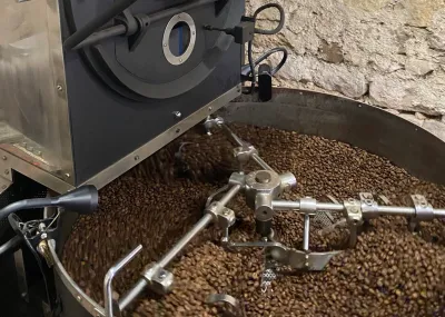 La transformation des grains est réalisée par Régis dans sa micro-torréfaction de Bergheim. Il brunit les grains pour qu’ils atteignent leur fameuse couleur “robe de moine” sur un petit torréfacteur artisanal. Ils sont cuits par lots de 5 kilos au maximum, gage supplémentaire de qualité.